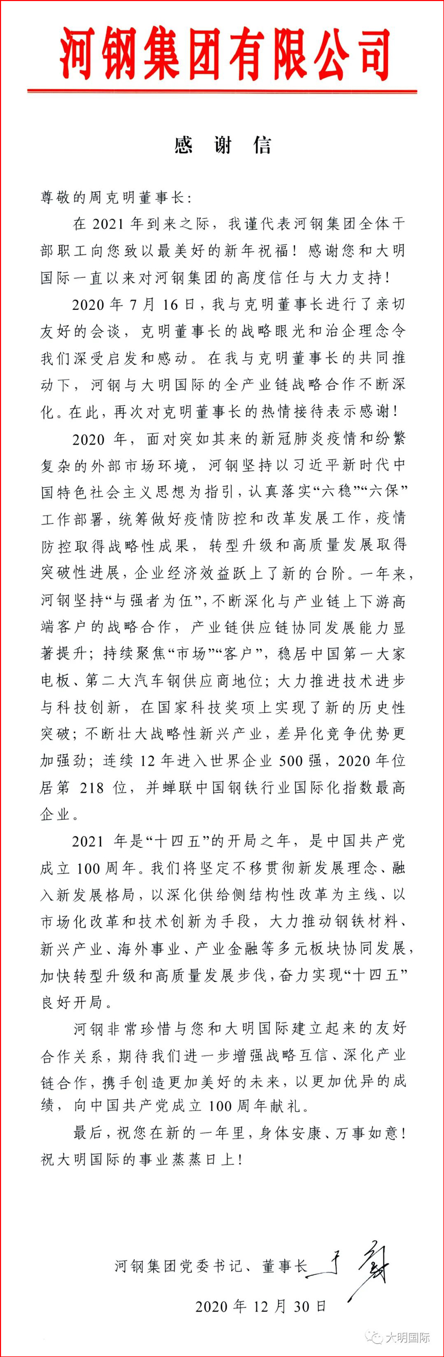2021年新年之際,于勇董事長特致信大明國際,對雙方全產業鏈戰略合作所取得的成功給予了肯定,并希望進一步增強戰略互信、深化產業鏈合作、攜手共創。大明國際將繼續一如既往地與河鋼合作推進重大工程項目,戰略客戶服務,為客戶協同創造價值,強化“鋼廠—大明—客戶”產業鏈合作模式。