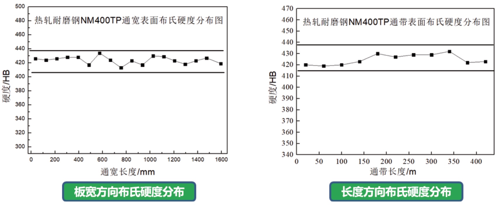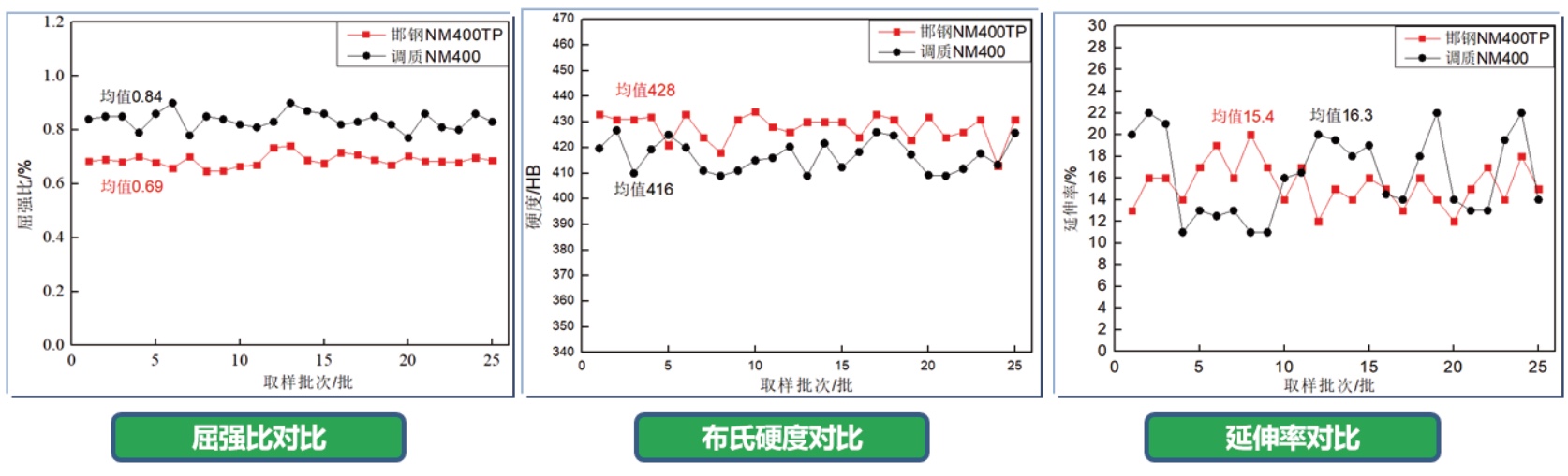 NM400TP性能分布情況(45個(gè)批次):布氏硬度高度均勻,波動(dòng)<±15HBW,均勻磨損,保證使用壽命。抗拉強(qiáng)度≥1400MPa,延伸率>11%,保證馬氏體超高強(qiáng)耐磨鋼的加工、成型性能。